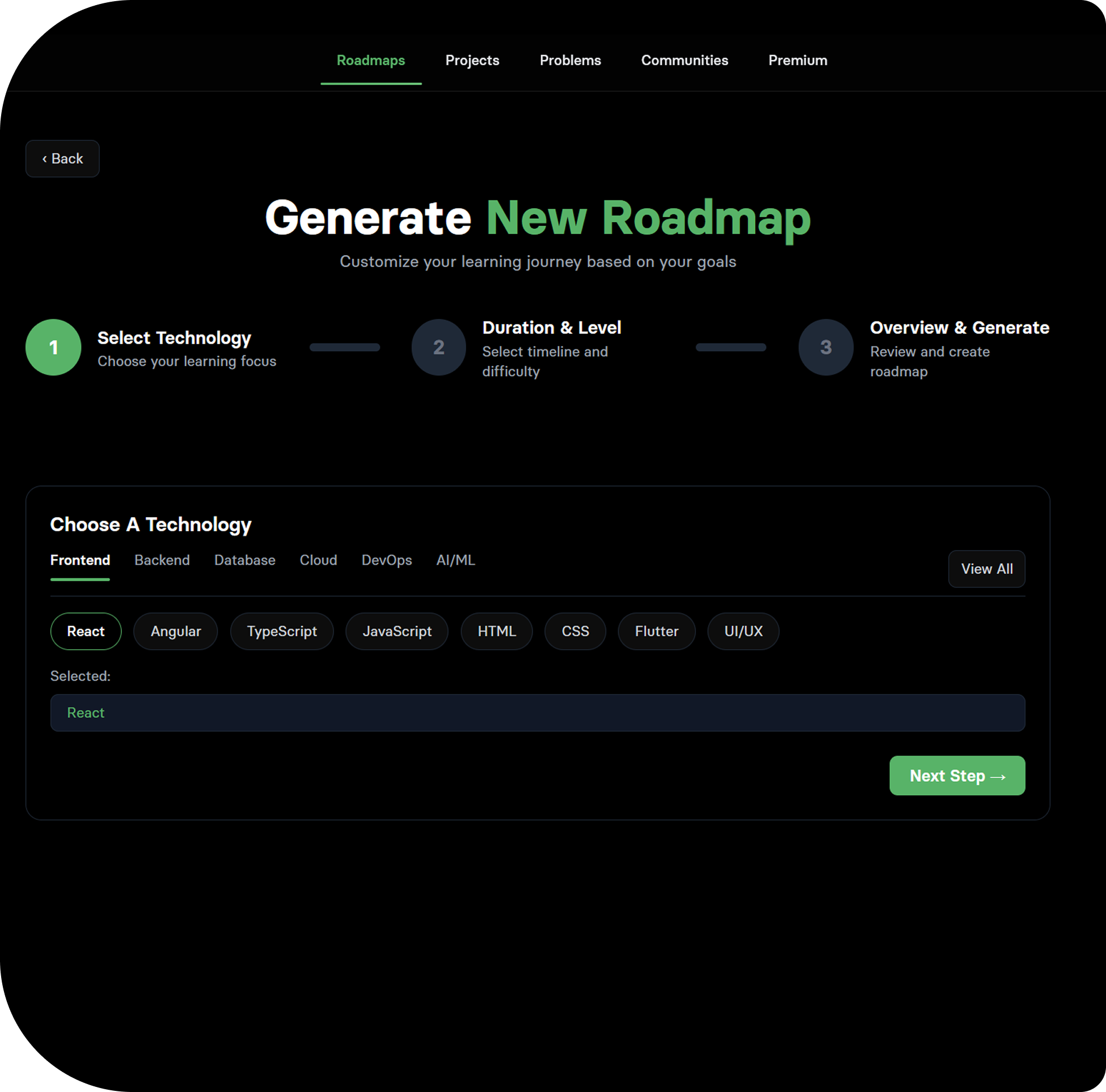 Ladder1's AI Roadmaps guide you step by step through your coding journey. Each path adapts to your skills and progress, ensuring you learn efficiently from fundamentals to advanced mastery.